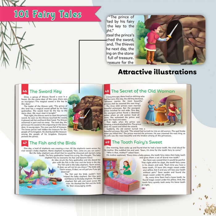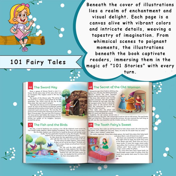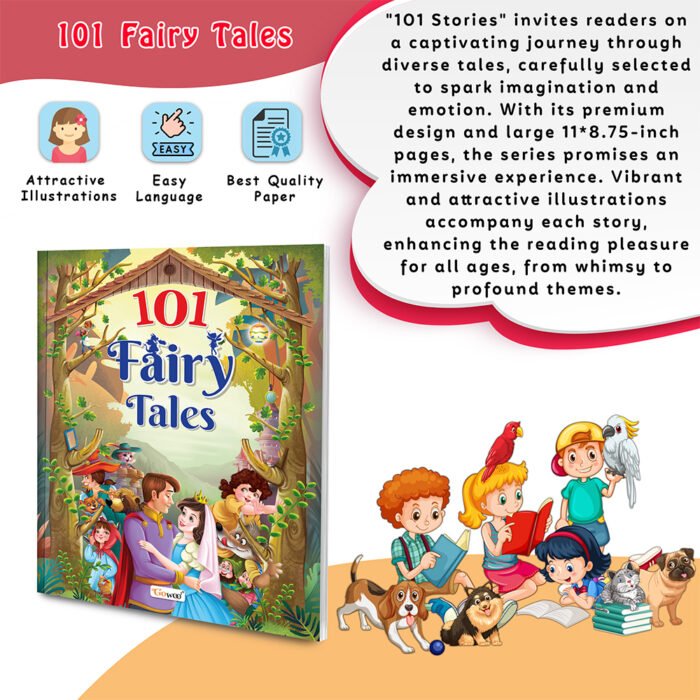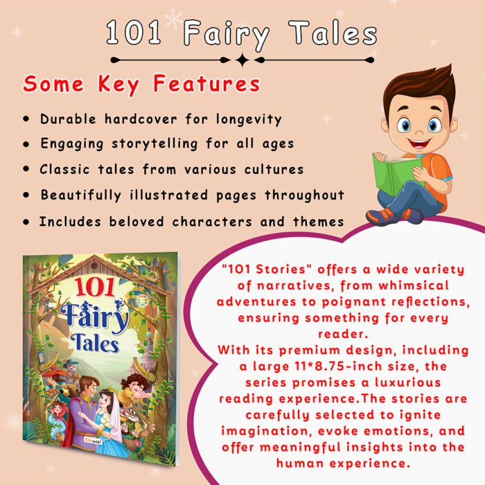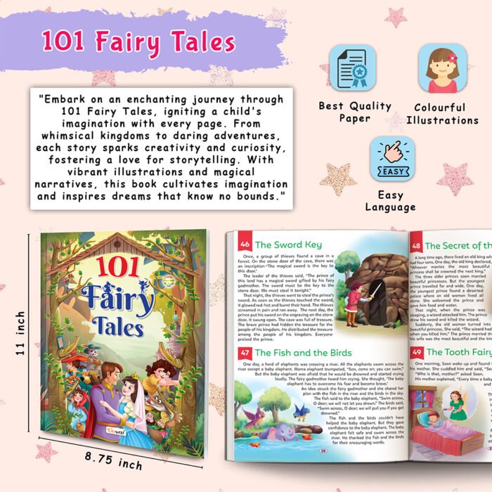 Embark on an enchanting adventure with “101 Fairy Tales” by GOWOO, a captivating collection that transports readers to magical realms filled with wonder and imagination. This beautifully crafted book measures a generous 11×8.5 inches, offering ample space for vibrant illustrations to come to life and ignite the imagination of readers young and old. Within its pages lie timeless tales of princesses, brave heroes, talking animals, and cunning villains, each story brimming with charm and moral depth. From the benevolent guidance of fairy godmothers to the trials faced by courageous protagonists, every story presents an opportunity for readers to learn valuable life lessons and explore the power of kindness, courage, and resilience.Whether it’s a bedtime story shared with loved ones or a quiet moment of solo adventure, this collection promises to captivate and inspire. Rediscover beloved classics and discover new favorites as you immerse yourself in the rich tapestry of folklore and fantasy. With its timeless appeal and captivating storytelling, “101 Fairy Tales” is a must-have addition to any library, promising endless hours of entertainment and enchantment for generations to come.