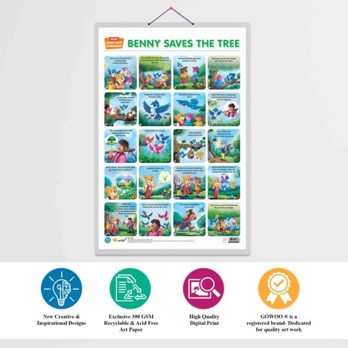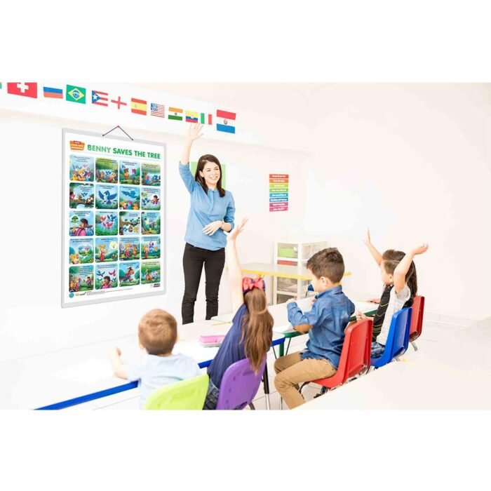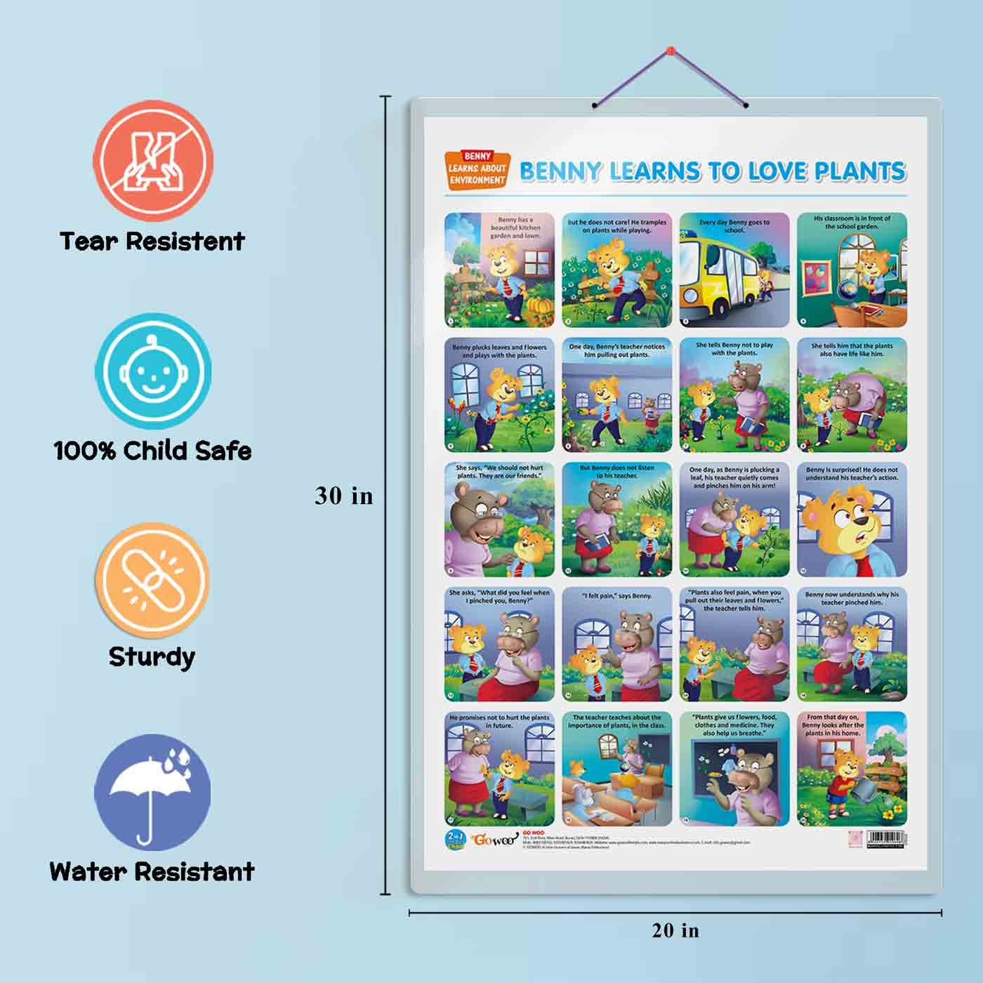 The Benny’s Environmental Adventures Chart features two sides: “Benny Learns to Love Plants” and “Benny Saves the Tree.” Each side showcases engaging illustrations of Benny, a curious character on environmental journeys. Through these stories, children learn about the importance of plants, their role in the ecosystem, and the significance of conserving trees.