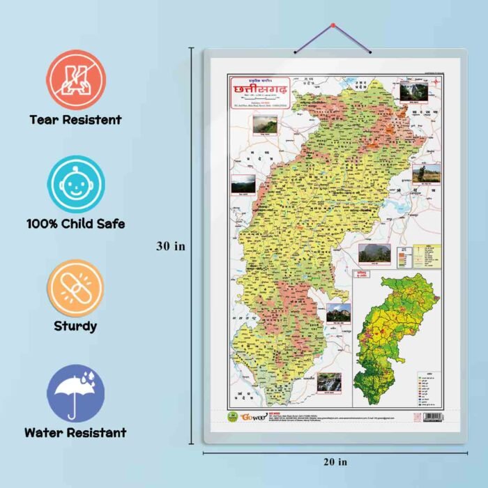 Introducing our “2 in 1 Chhattisgarh Political and Physical Map” chart in Hindi. This chart is an excellent educational resource for homeschooling kindergarten students. Its 20?x30? inch size offers a detailed depiction of Chhattisgarh’s political and physical features in the Hindi language.