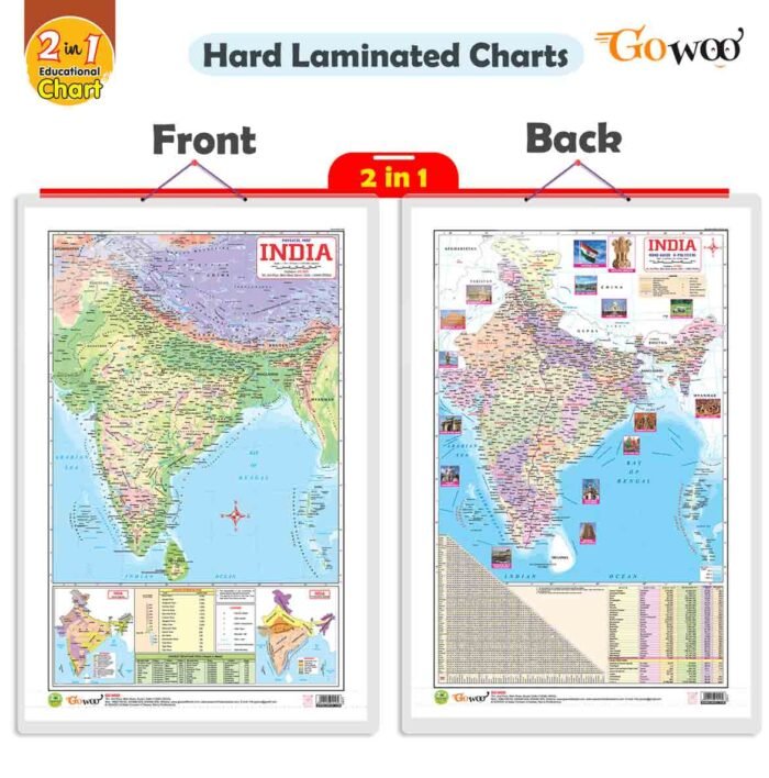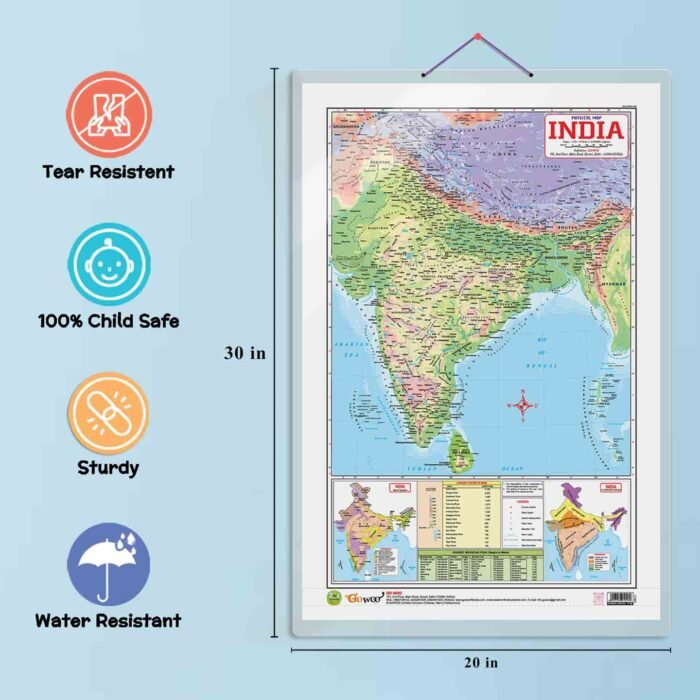 Introducing our versatile “2 in 1 India Political and Physical Map in English” chart, measuring 20″x30″ inches. This chart is a must-have educational tool that combines a detailed political map of India with a comprehensive physical map.