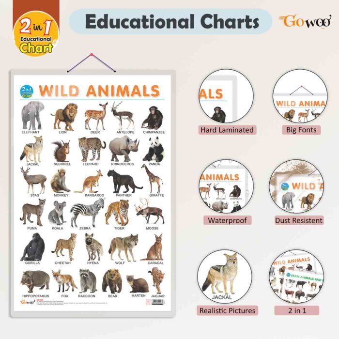 Introducing our 2-in-1 Wild and Farm Animals & Pets Chart, the perfect educational tool for young learners. This chart measures 20″x30″ inches, providing a large and easily visible display for children. It is designed to be non-tearable and waterproof, ensuring its durability and longevity even in the hands of enthusiastic learners. The double-sided lamination adds an extra layer of protection, making it resistant to spills and stains, and allowing for easy cleaning.