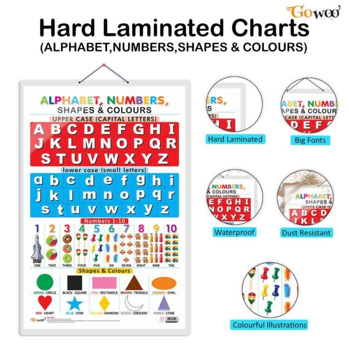 Our chart is made of high-quality materials that are non-tearable and waterproof. The double-sided lamination makes it durable and long-lasting. The front side of the chart displays the English alphabet with uppercase and lowercase letters, numbers from 1 to 100, basic shapes, and primary colours. The backside of the chart shows the Hindi alphabet with vowels and consonants, numbers from 1 to 100, basic shapes, and primary colours.