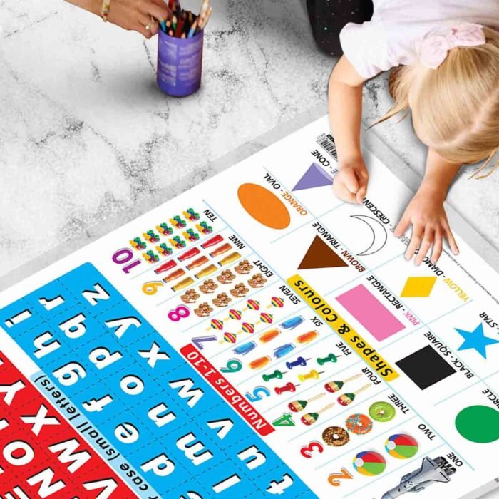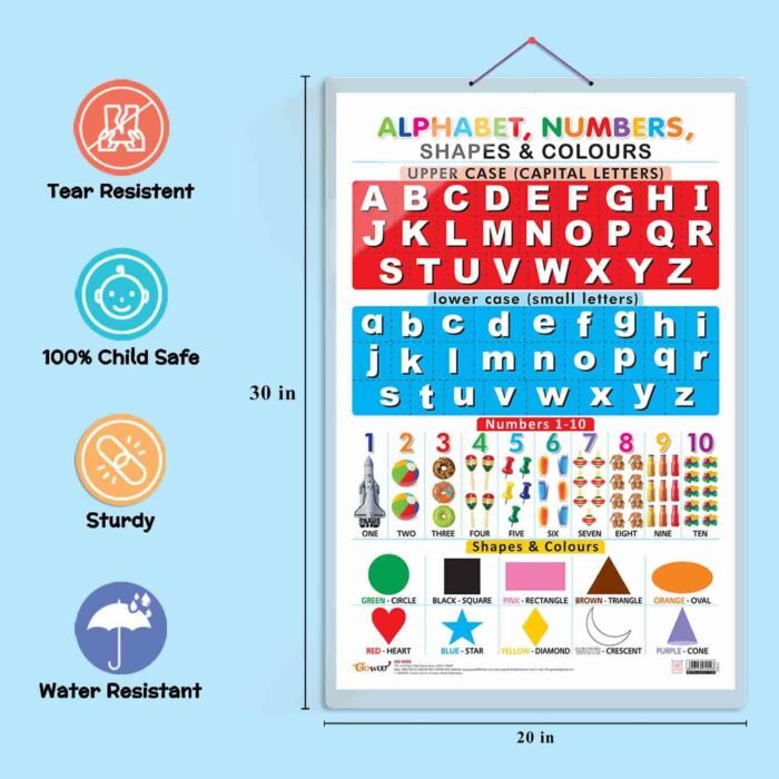 Introduce your little ones to the world of learning with our Alphabet, Numbers, Shapes & Colors chart. This chart is perfect for homeschooling, kindergarten, and nursery school kids. It is designed to help your children learn the alphabet, numbers, shapes, and colors while having fun. The chart is 20″x30″ inches, making it easy for your child to see the letters and numbers.