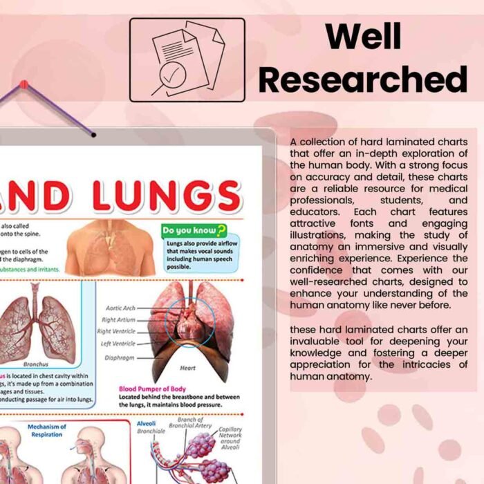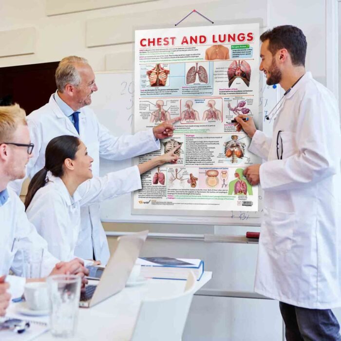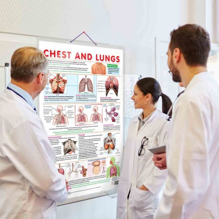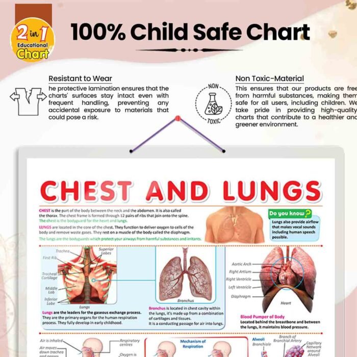 GOWOO presents a CHEST AND LUNGS CHART in 20″ x 30″ inches. Unravel the complexities of the chest and lungs with our informative chart, meticulously crafted to offer comprehensive insights. This educational resource provides detailed information about the chest and lungs, with specific diagrams and clear labelling names for easy identification. The chart delves into the remarkable role of the respiratory system, explaining how the thymus, esophagus, trachea, and diaphragm contribute to breathing and respiratory health. Medical students will gain a profound understanding of these essential structures’ intricate anatomy and physiology. Designed to inspire a passion for scientific inquiry, this chart ignites curiosity among learners. Its hard-laminated surface ensures endurance, making it a reliable study aid for classrooms and study spaces. As learners delve into the intricacies of the chest and lungs, they will develop a profound appreciation for the marvels of human physiology and the vital role of these organs in sustaining life.