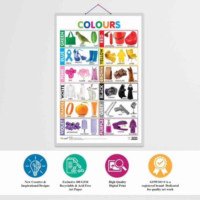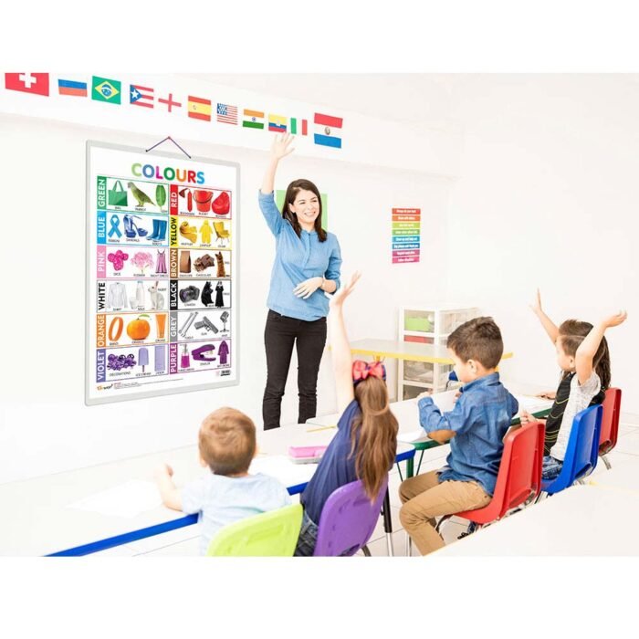 The Colours Chart is an excellent educational tool for young learners to learn about different colours and their names. The chart is 20″x30″ inches and easily visible in classrooms or homeschooling environments. Made with high-quality materials, the chart is non-tearable and waterproof, ensuring its longevity and durability. The Double Sided Lamination adds an extra layer of protection against daily wear and tear, spills, and accidental drops.