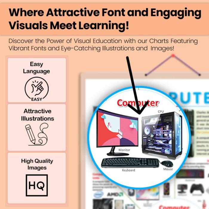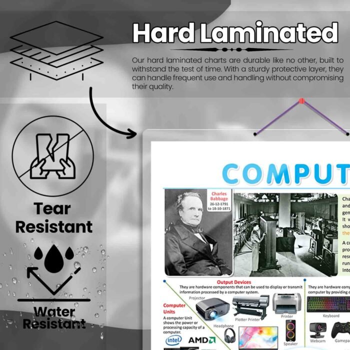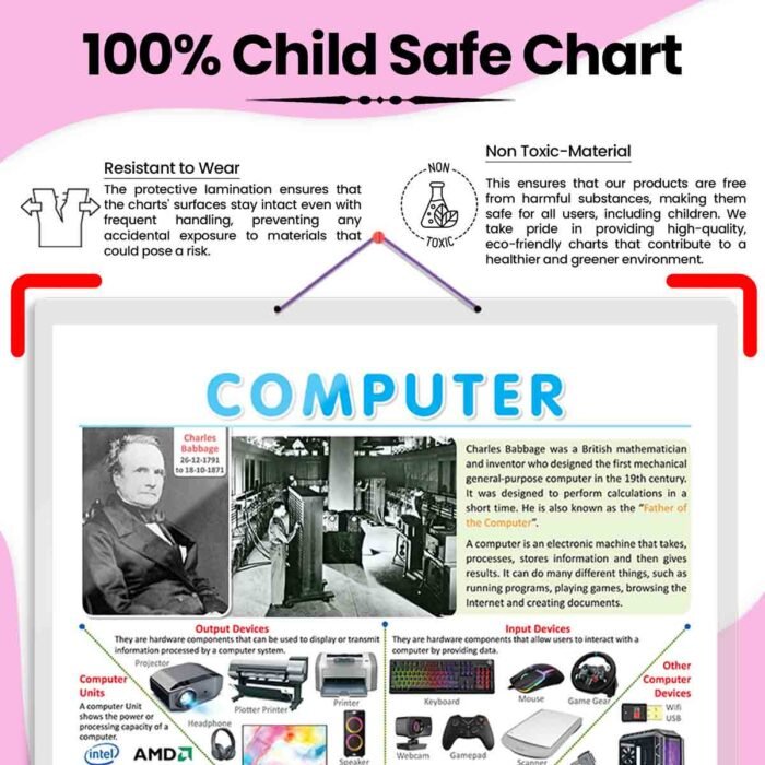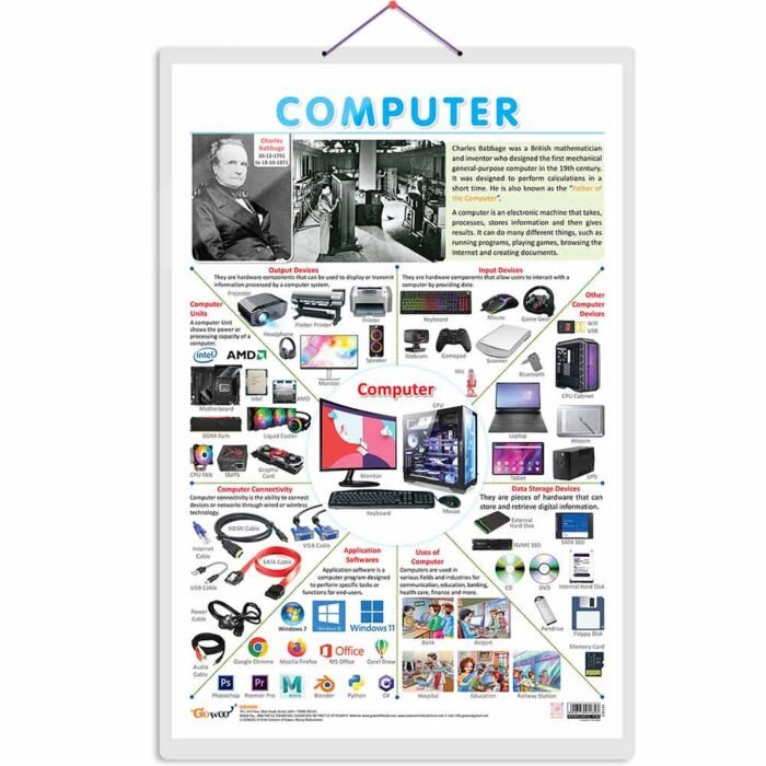 GOWOO presents THE COMPUTER CHART in a 20″ x 30″ size. Unravel the captivating history and functionality of computers with our illustrative Computer Chart. Embark on a journey from the time of Charles Babbage, widely recognized as the father of the computer, to the present-day advanced computer devices packed with powerful capabilities. Gain deeper insight into the working of input devices like keyboards, mice, and scanners, which provide a user-friendly way of instructing computers, and learn about output devices, such as displays and speakers that the computer uses to inform, alert, and entertain us. Discover the multitude of uses of computers that range from processing and analyzing extensive data for scientific research to functioning as a global communication platform and entertaining users. The chart also outlines the different types of application software, including productivity tools like word processors and spreadsheets, as well as programs for graphic design and multimedia editing. Our Computer Chart is your one-stop resource for all things computer!