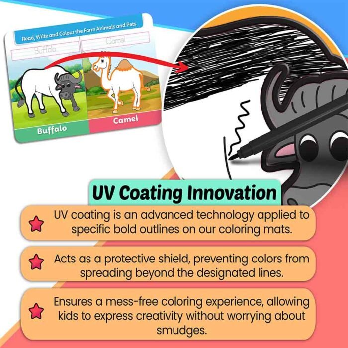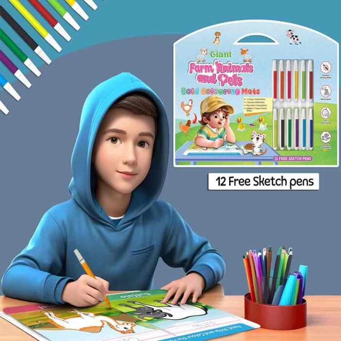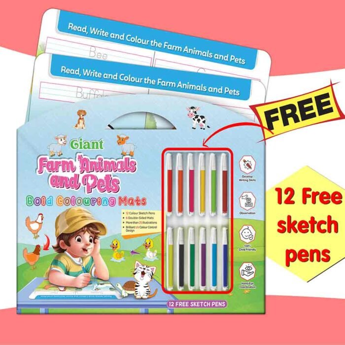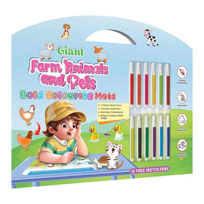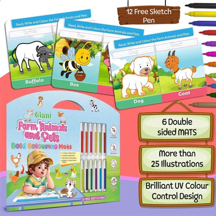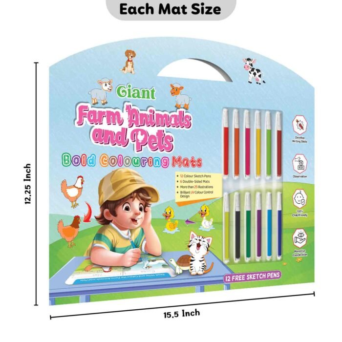 GoWoo presents the Farm Animals and Pets Bold Coloring Mat ? an exciting and educational tool designed to inspire creativity and learning in children!This oversized coloring mat features bold and vibrant illustrations of various farm animals and pets, including cows, pigs, chickens, dogs, cats, and more. With ample coloring space, this mat allows children to immerse themselves in the world of farm animals and pets and express their creativity freely.
