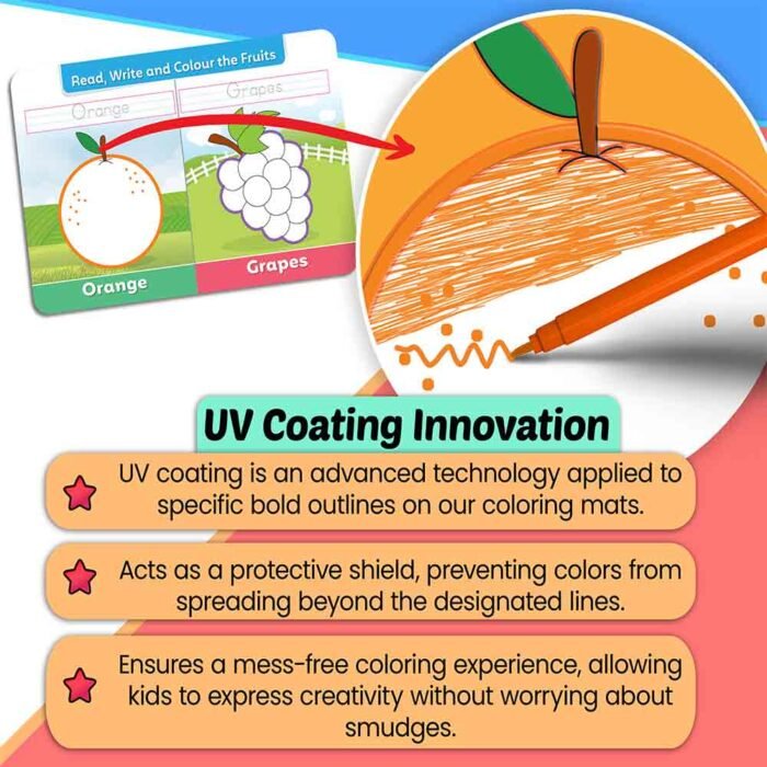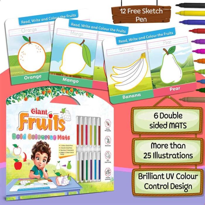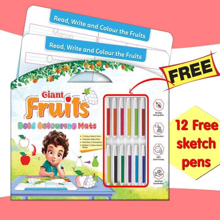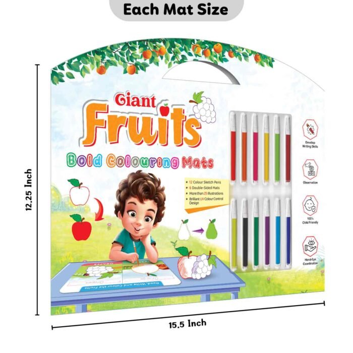 GoWoo presents the Giant Fruits Bold Coloring Mat ? an exciting and educational tool designed to inspire creativity and learning in children!This oversized coloring mat features bold and colorful illustrations of a variety of fruits, providing children with a fun and engaging way to learn about different types of fruits and their vibrant colors. With ample coloring space, this mat allows children to explore and express their creativity freely.Included with the mat are 12 free sketch pens, offering children a rainbow of colors to bring their fruity creations to life.