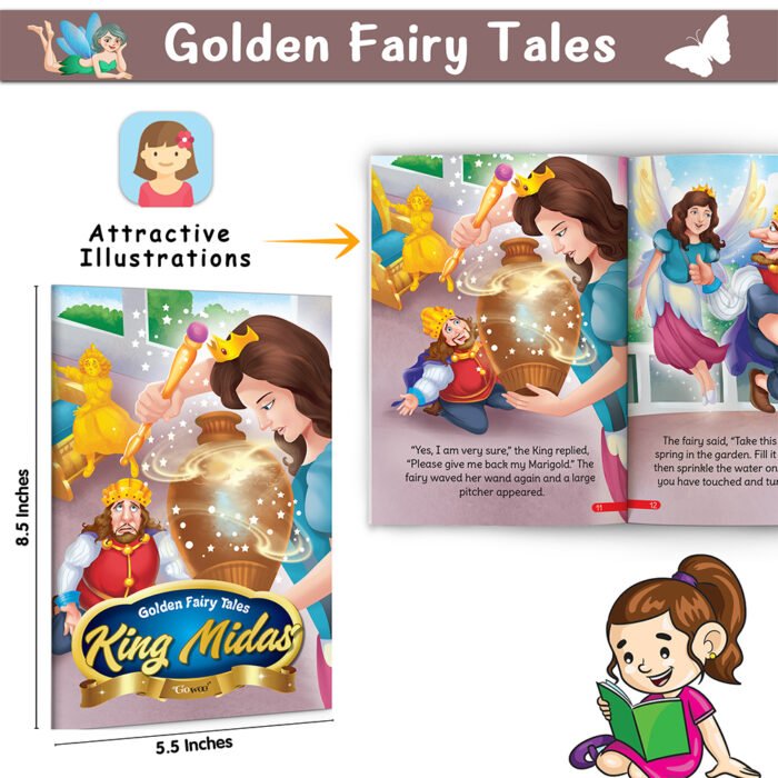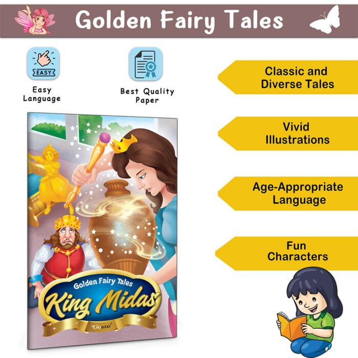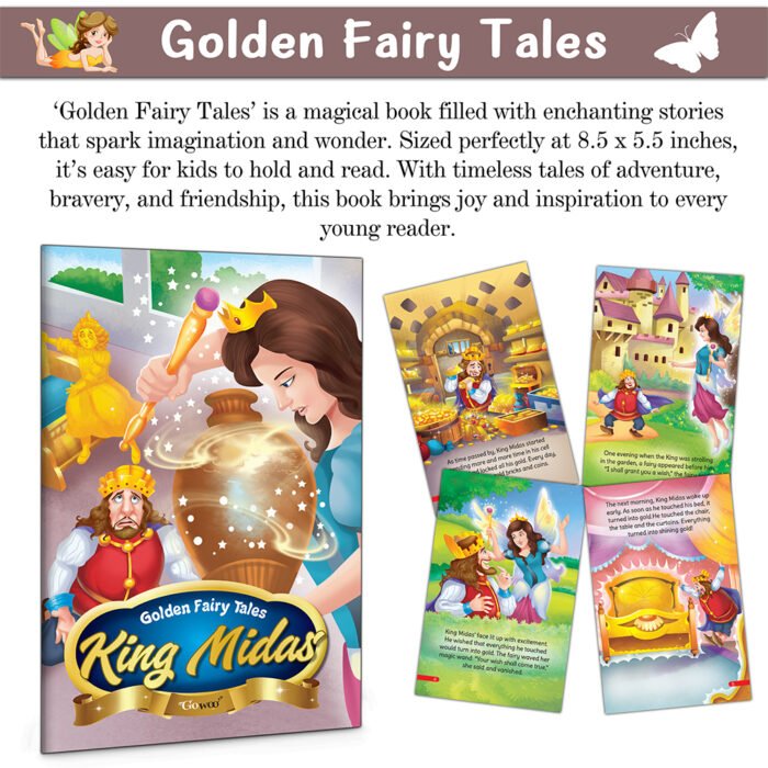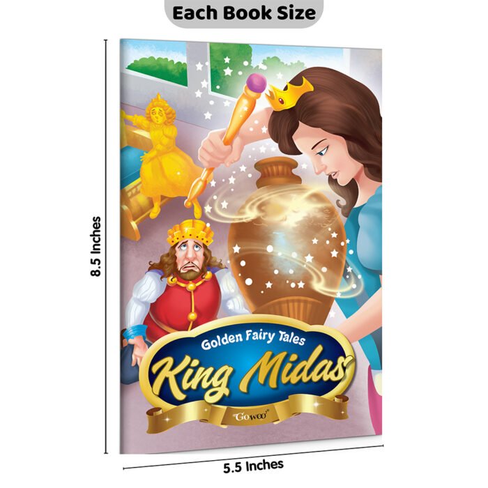 Golden Fairy Tales: King Midas by Gowoo (8.5 x 5.5 inches) retells the timeless story of greed, gratitude, and the true meaning of happiness. Follow the tale of King Midas, whose wish for everything he touches to turn to gold brings unexpected consequences. Beautifully illustrated and compact in size, this book is perfect for young readers to explore during storytime or independent reading. With its engaging narrative and powerful life lesson about valuing what truly matters, this enchanting story is a wonderful addition to any child?s collection of classic fairy tales.