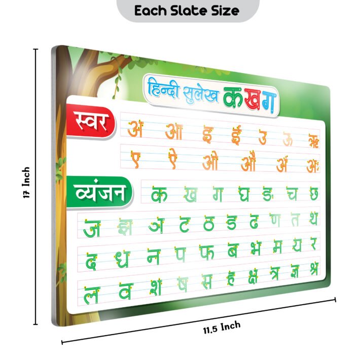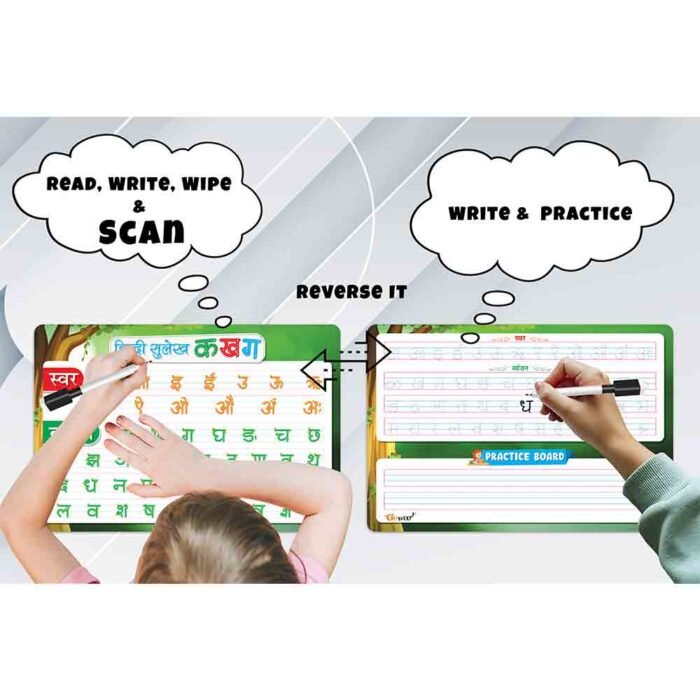 Introducing the Unlimited Write and Wipe Practice Board for Hindi Sulekh, sized at 17″ x 11.5″. This innovative tool is designed to facilitate the practice of Hindi handwriting and letter formation in a convenient, reusable format.The spacious dimensions of the 17″ x 11.5″ board provide ample space for learners to practice writing Hindi letters, words, and sentences. Whether it’s mastering the basic strokes of Hindi script or refining cursive handwriting, the board offers enough room for users to comfortably write and trace characters.