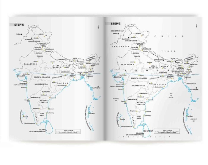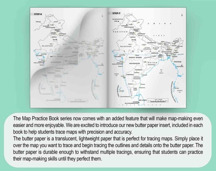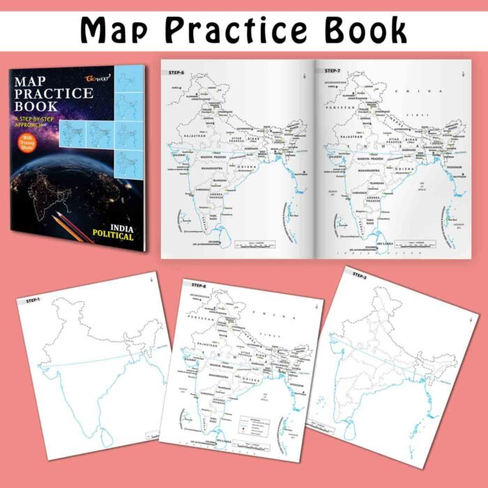 The “India Political – Map Practice Book” is a valuable resource designed to help individuals of all ages and educational backgrounds develop a deep understanding of India’s political map. Its size is 11″ x 8.75″.This book includes a tracing sheet that students can use to trace the map easily. There are 8 steps to trace the maps.