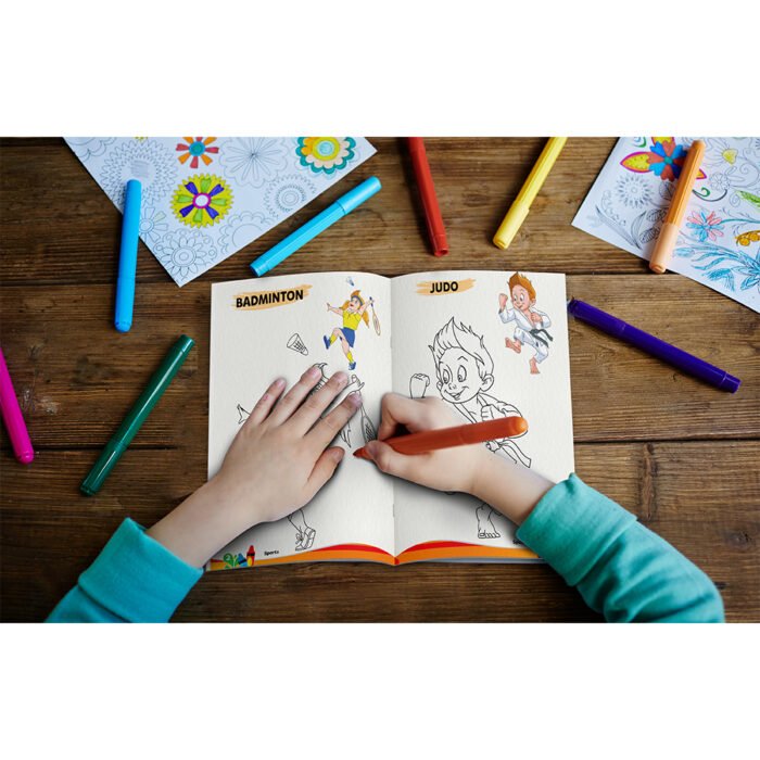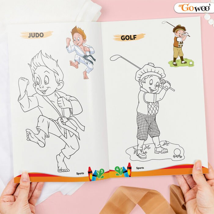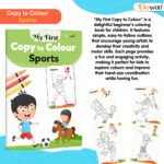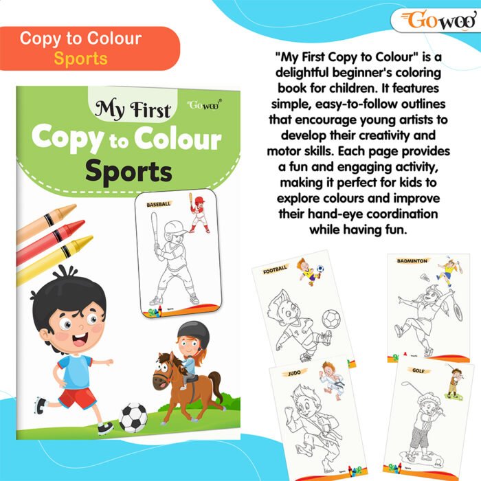 My First Copy to Colour Sports by Gowoo is an exciting and dynamic coloring book designed to introduce young children to the world of sports. With its compact 8.5 x 5.5-inch size, it?s perfect for little hands to hold and use anywhere, whether at home or on the go. Each page features fun, simple illustrations of various sports, such as soccer, basketball, and swimming, with clear outlines for kids to trace, copy, and color. This book encourages creativity, promotes fine motor skills, and helps children learn about different sports in a playful and interactive way. Ideal for preschoolers and early learners, it?s a great way to inspire a love for sports and art.