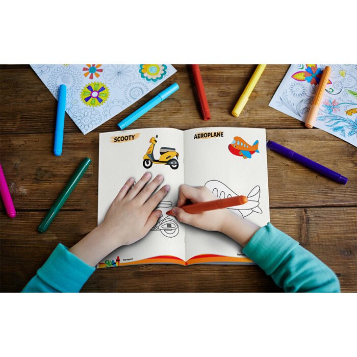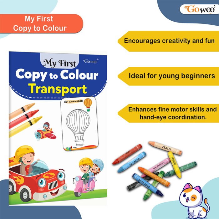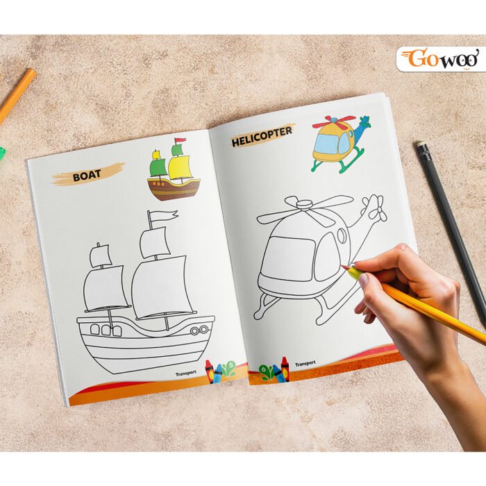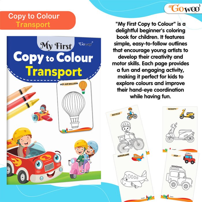 My First Copy to Colour Transport by Gowoo is an exciting coloring book designed to introduce young children to the world of transportation. With its compact 8.5 x 5.5-inch size, it?s perfect for little hands to hold and enjoy at home or on the go. Each page features simple and bold illustrations of various modes of transport, such as cars, trains, airplanes, and boats, with clear outlines for kids to trace, copy, and color. This interactive book helps children develop fine motor skills, learn about different types of transportation, and explore their creativity in a fun and engaging way. Ideal for preschoolers and early learners, it?s a wonderful way to combine learning and artistic expression.