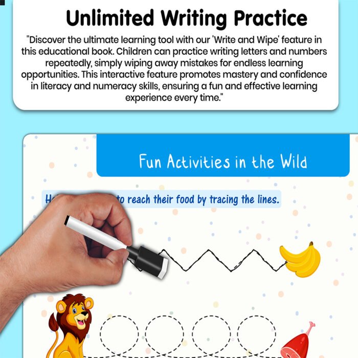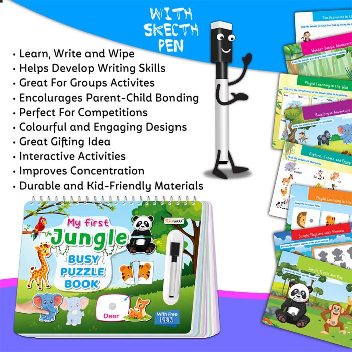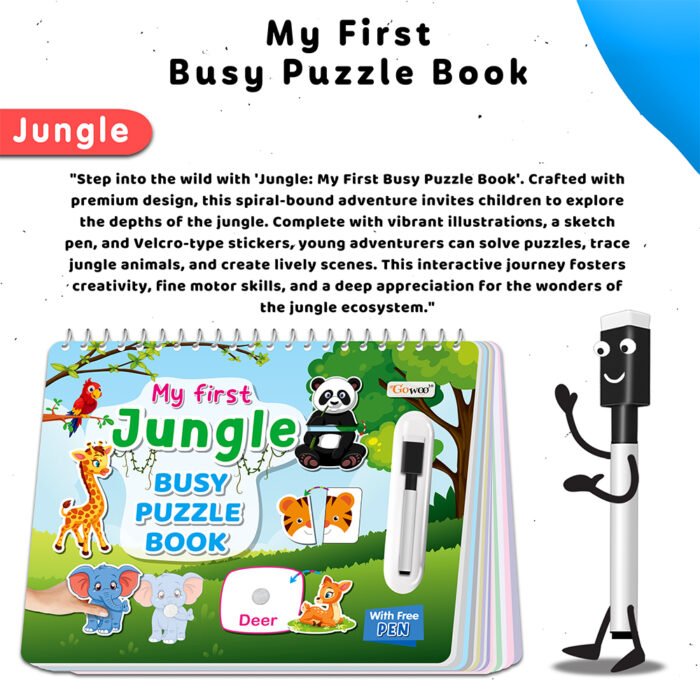 Introducing “My First Jungle Busy Puzzle Book” by GOWOO! This captivating educational resource is designed to transport young explorers into the heart of the jungle as they embark on a thrilling puzzle-solving adventure. Measuring 8.9×11.5 inches, this book provides ample space for hands-on exploration and learning. With its innovative velcro activity design, children can immerse themselves in matching jungle-themed puzzle pieces, enhancing their fine motor skills and cognitive development. But that’s not all – “My First Jungle Busy Puzzle Book” also doubles as a write and wipe task book! Equipped with special wipe-clean pages and a complementary pen, children can practice tracing jungle shapes and animals, reinforcing their understanding while fostering creativity and confidence. With its durable construction and interactive features, this book is the perfect companion for young adventurers. Spark your child’s imagination and curiosity with “My First Jungle Busy Puzzle Book” from GOWOO!