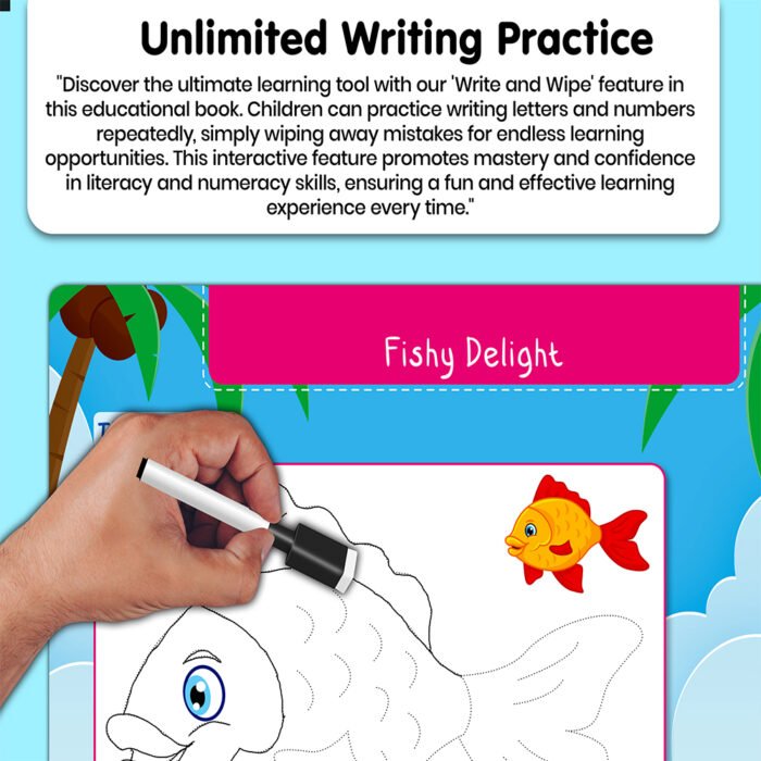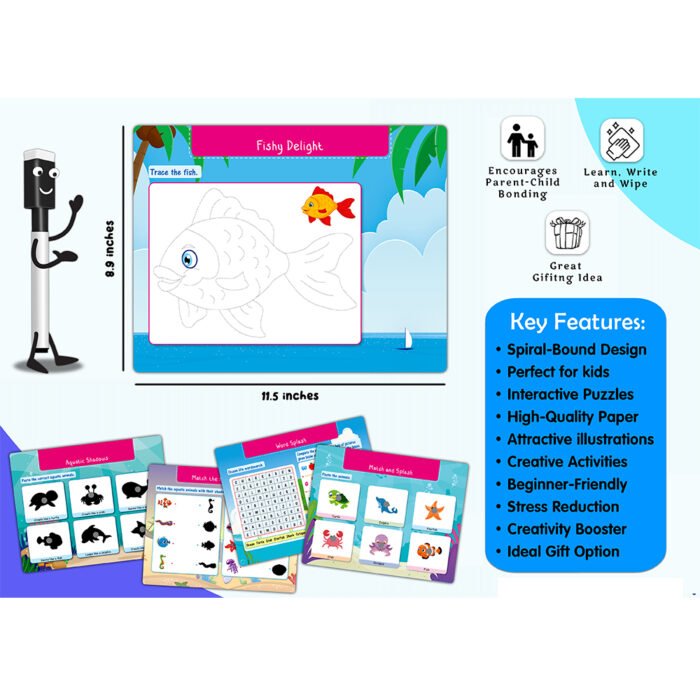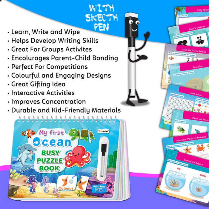 Introducing “My First Ocean Busy Puzzle Book” ? a thrilling dive into the depths of the sea! This interactive book is bursting with exciting activities, featuring velcro puzzles and wipe-and-write tasks that make learning about ocean life a fun adventure. With velcro activity pages, children can create vibrant underwater scenes, enhancing their fine motor skills and creativity as they match and attach pieces. The wipe-and-write tasks offer an interactive learning experience, allowing kids to practice tracing shapes, letters, and numbers with the included pen. This hands-on approach not only promotes early literacy but also sparks curiosity about the fascinating creatures that inhabit the ocean. Crafted to withstand the excitement of young explorers, this book is splash-proof and tear-resistant, ensuring it can accompany your little marine biologist on all their oceanic adventures. Whether at home or on-the-go, “My First Ocean Busy Puzzle Book” promises hours of entertainment and learning. So, grab your snorkel and get ready to explore the wonders of the sea!
