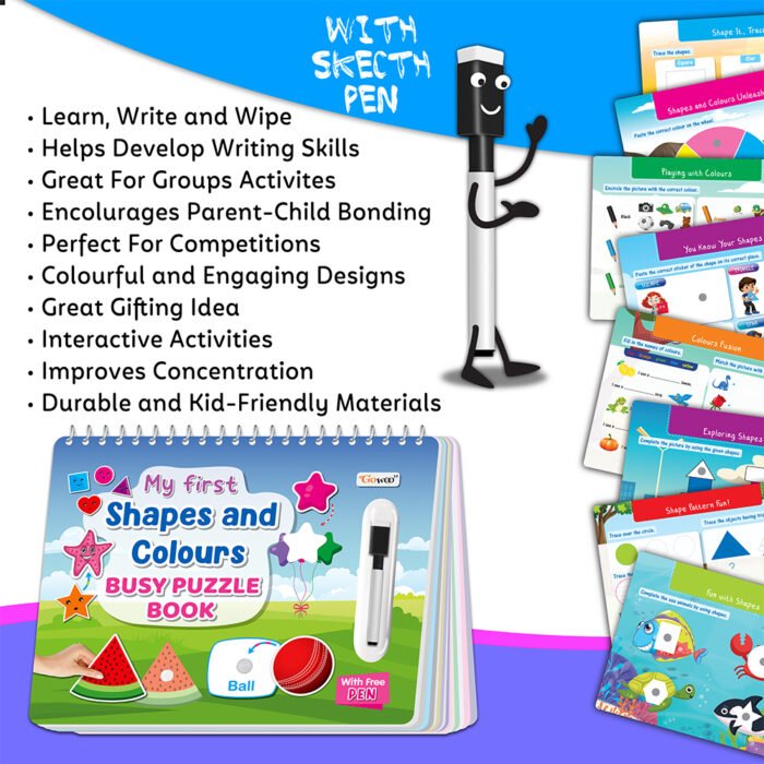 Introducing “My First Shapes and Colours Busy Puzzle Book” by GOWOO! This engaging educational tool is designed to introduce young children to the exciting world of shapes and colors in a fun and interactive way. Sized at 8.9×11.5 inches, this book provides ample space for exploration and learning. With its innovative velcro activity design, children can attach and detach puzzle pieces, enhancing their fine motor skills and hand-eye coordination. But that’s not all – “My First Shapes and Colours Busy Puzzle Book” also functions as a write and wipe task book! Equipped with special wipe-clean pages and a complementary pen, children can practice tracing shapes and colors, reinforcing their understanding while fostering creativity and confidence. With its durable construction and interactive features, this book is the perfect companion for early learners. Spark your child’s imagination and curiosity with “My First Shapes and Colours Busy Puzzle Book” from GOWOO!