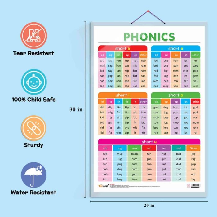 The “Phonics – 1” chart is invaluable for building foundational solid phonics skills. Its large size, non-tearable and waterproof construction, and double-sided lamination make it suitable for various educational settings. Whether used in homeschooling, kindergarten, or nursery classrooms, this chart is the perfect companion to support young learners’ phonics development and lay the groundwork for future reading success.