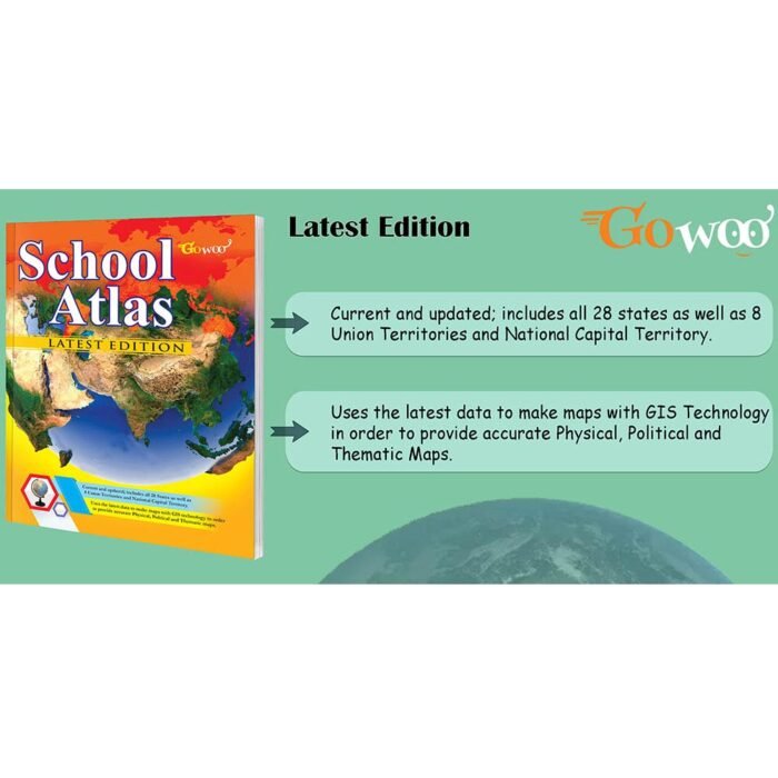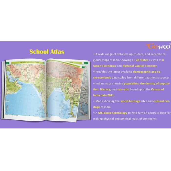 In summary, the Gowoo School atlas is an exceptional product combining style and functionality to create a comprehensive and informative resource for anyone interested in geography and culture. Its high-quality art paper, use of the latest data and GIS technology, and detailed maps of India, SAARC countries, and the world make it an indispensable tool for students, educators, and researchers.