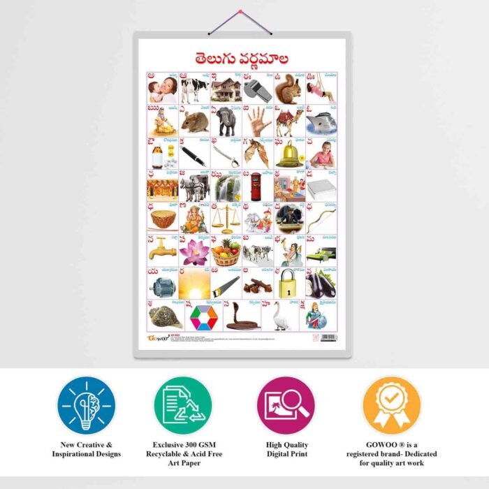 The Telugu Alphabet chart features the complete Telugu alphabet in a clear and organised format. Each letter is accompanied by a visual representation, helping children to associate the letter with its corresponding sound easily. The vibrant colours and attractive visuals on the chart capture the attention of young minds and make learning enjoyable.
