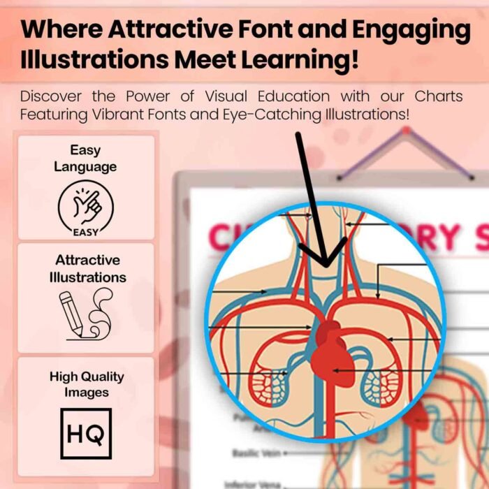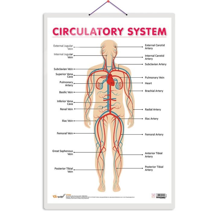 GOWOO presents THE CIRCULATORY SYSTEM CHART in 20″ x 30″ inches. Unravel the complexities of the circulatory system with our informative chart, meticulously crafted to offer comprehensive insights. This educational resource presents detailed illustrations of the heart’s structure and clear labelling names to identify essential components easily. The chart delves into the remarkable pulmonary and systemic circulation processes, emphasising their significance in maintaining the body’s homeostasis. Learners will understand how blood flows through the heart and the intricate venous and arterial systems network. Designed to inspire a passion for scientific inquiry, this chart ignites curiosity among learners. Its hard-laminated surface ensures endurance, making it a reliable study aid for classrooms and study spaces. As learners delve into the intricacies of the circulatory system, they will develop a profound appreciation for the marvels of human physiology and the vital role of blood circulation.