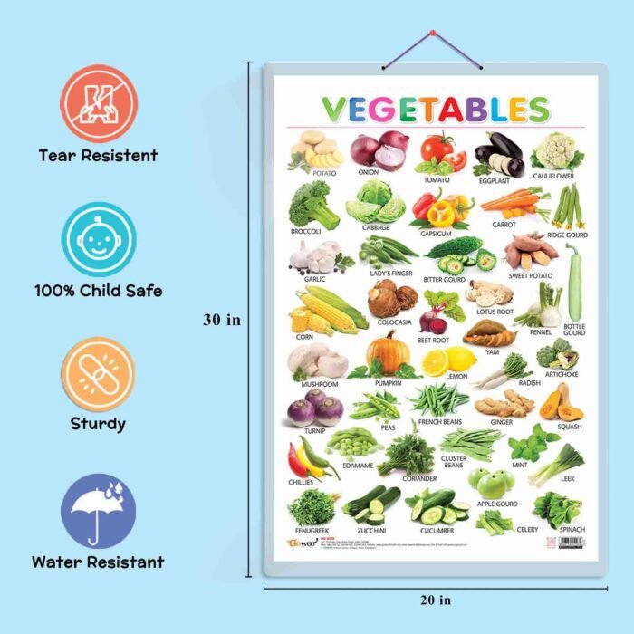 The Vegetables Chart is a valuable educational tool for young learners. With a size of 20″x30″ inches, it is easily visible and perfect for use in classrooms or homeschooling environments. Made with high-quality materials, the chart is non-tearable and waterproof, ensuring its longevity and durability. The Double Sided Lamination adds an extra layer of protection against daily wear and tear, spills, and accidental drops. The Vegetables Chart is an engaging way to teach young children about different types of vegetables, their names, and their unique features. It is perfect for Kindergarten and Nursery students learning about vegetables for the first time. Homeschooling parents can also use the chart as a visual aid to teach their children about the importance of including vegetables in their diet and healthy eating habits. The Vegetables Chart is an excellent way to promote healthy eating habits and encourage children to try new vegetables. Overall, the Vegetables Chart is a must-have for any classroom or homeschooling environment focusing on nutrition and healthy eating.