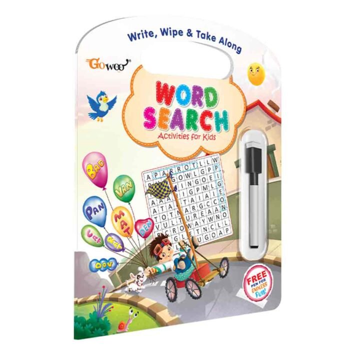GoWoo proudly presents the Write, Wipe & Take Along Activity Book: Word Search Activities for Kids! This convenient activity book, sized at 11 x 8.5 inches, is designed to provide endless entertainment and learning opportunities for children on the go.Featuring a wipe-clean surface, this activity book allows children to engage in the fun and challenging task of finding hidden words in a grid of letters. With just a dry-erase marker or cloth, children can circle or mark the words they find, then wipe the page clean to start a new word search, providing endless opportunities for puzzle-solving and enjoyment.